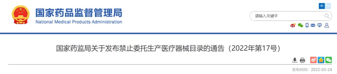 為加強醫(yī)療器械生產監(jiān)管,保障醫(yī)療器械安全、有效,根據(jù)《醫(yī)療器械監(jiān)督管理條例》(國務院令第739號),國家藥品監(jiān)督管理局組織修訂了《禁止委托生產醫(yī)療器械目錄》,現(xiàn)予發(fā)布,自2022年5月1日起施行,原國家食品藥品監(jiān)督管理總局《關于發(fā)布禁止委托生產醫(yī)療器械目錄的通告》(2014年第18號)同時廢止。特此通告。