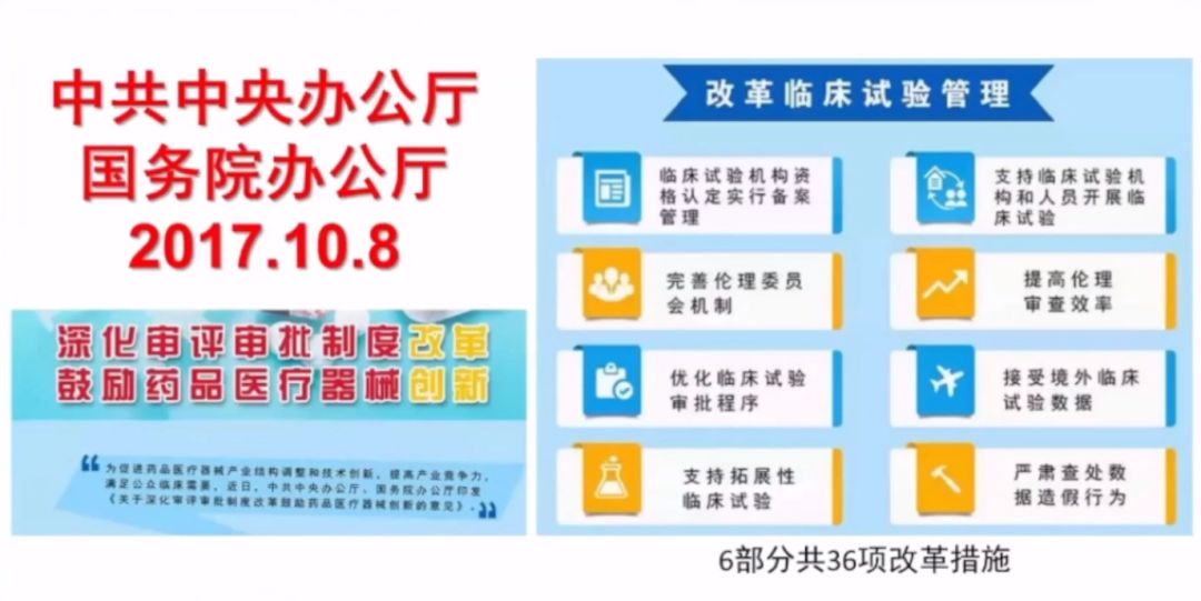 2017年10月8日,為鼓勵(lì)藥品醫(yī)療器械科技創(chuàng)新,提高上市產(chǎn)品質(zhì)量和產(chǎn)業(yè)競(jìng)爭(zhēng)力,滿(mǎn)足公眾臨床需要,中共中央辦公廳、國(guó)務(wù)院辦公廳印發(fā)了《關(guān)于深化審評(píng)審批制度改革鼓勵(lì)藥品醫(yī)療器械創(chuàng)新的意見(jiàn)》。在多方面深化了審批制度,包括改革臨床試驗(yàn)管理、加快上市審評(píng)審批、促進(jìn)藥品創(chuàng)新和仿制藥發(fā)展、加強(qiáng)藥品醫(yī)療器械全生命周期管理、提升技術(shù)支撐能力、加強(qiáng)組織實(shí)施等。