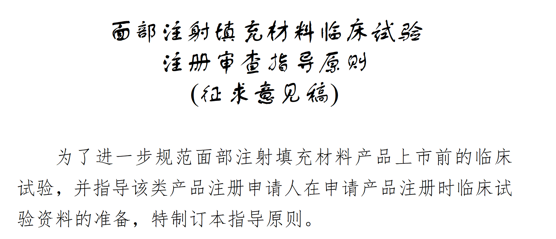 為進一步規(guī)范面部注射填充材料產(chǎn)品上市前的臨床試驗,國家藥監(jiān)局器審中心發(fā)布《面部注射填充材料臨床試驗注冊審查指導(dǎo)原則(征求意見稿)》,針對不用材料面部注射產(chǎn)品臨床試驗中的適用范圍、試驗設(shè)計、臨床評價指標、樣本量、入排標準等進行了規(guī)范。