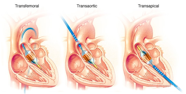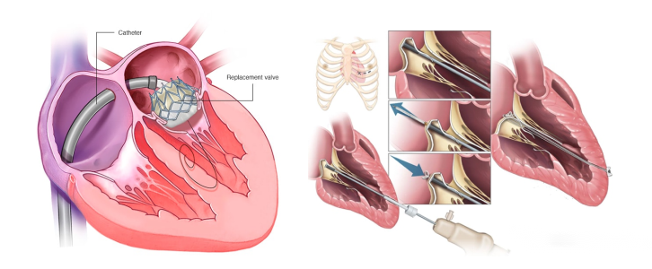 相當(dāng)于外科手術(shù)的百年歷史,介入手術(shù)相對年輕,其原理是人工瓣膜被壓縮在細(xì)小的導(dǎo)管中,經(jīng)皮穿刺進(jìn)入人體,輸送至需要治療的瓣膜位置,在超聲等影像設(shè)備的支持下,完成瓣膜修復(fù)或更換。由于介入手術(shù)無需心臟停跳和體外循環(huán),手術(shù)安全性大大提高,因此尤其適用于外科手術(shù)的中高?;颊吆透啐g患者。得益于影像技術(shù)和介入產(chǎn)品的快速發(fā)展,介入手術(shù)的適應(yīng)癥也在逐步擴(kuò)大,部分外科手術(shù)低風(fēng)險患者也可選擇行介入治療。