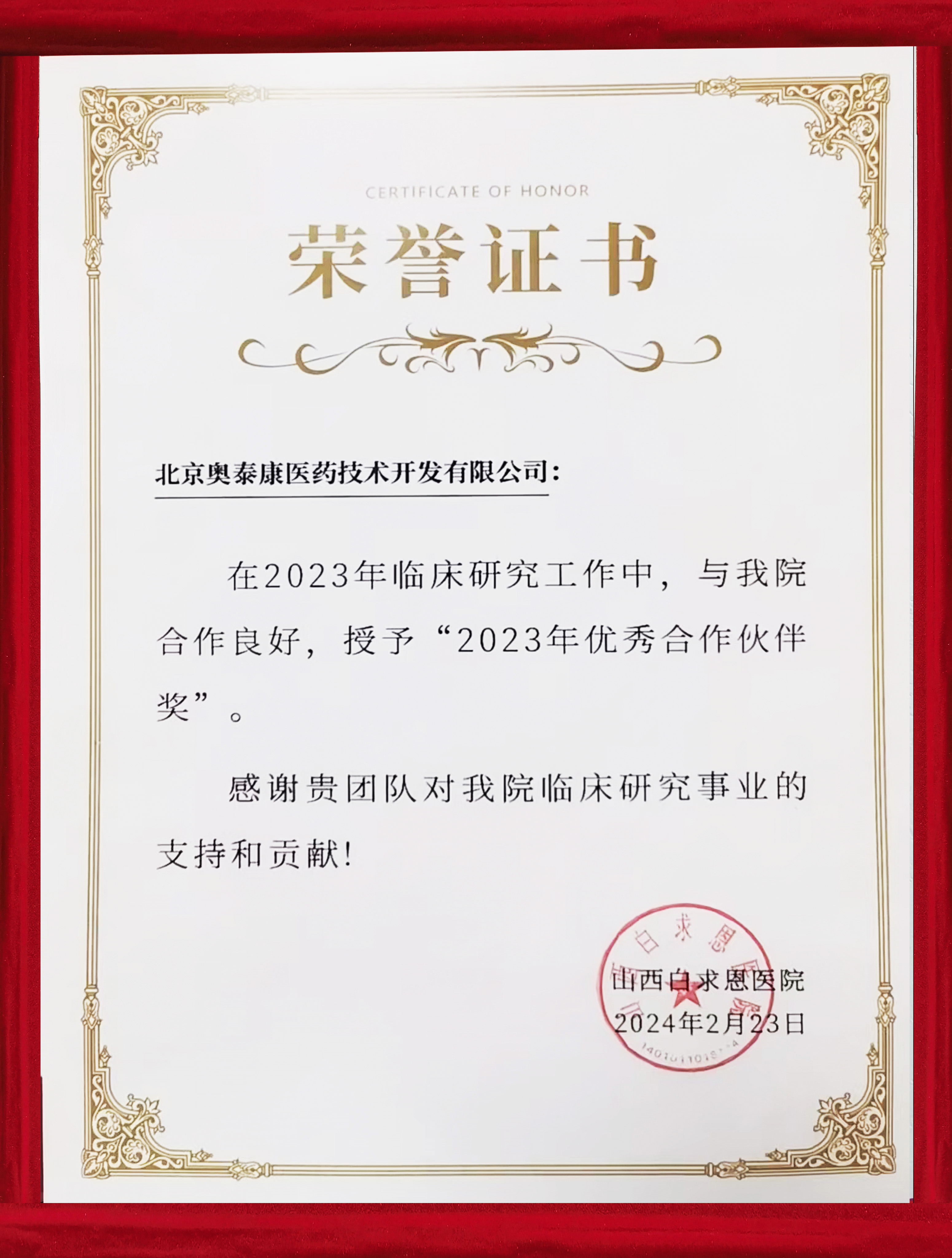 喜報(bào)~奧泰康榮獲山西白求恩醫(yī)院 同濟(jì)山西醫(yī)院“2023年優(yōu)秀合作伙伴獎(jiǎng)”攜手前行,推進(jìn)臨床研究事業(yè)高質(zhì)量發(fā)展???
