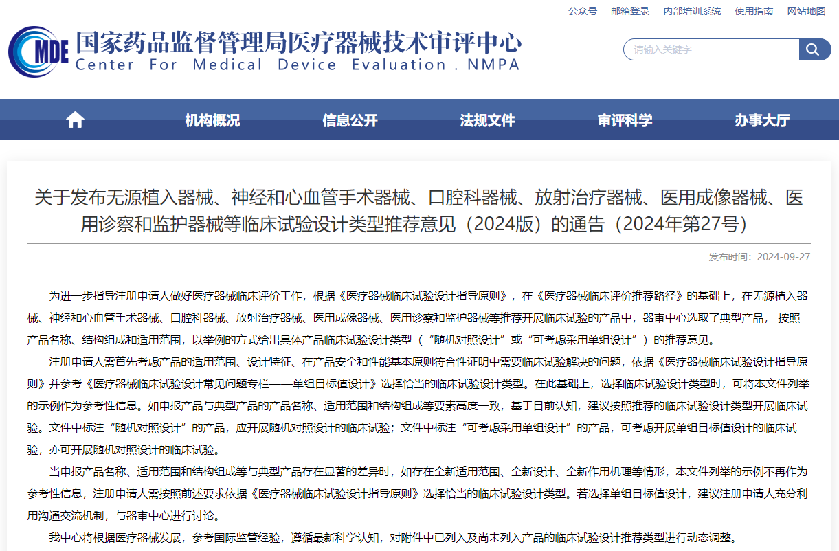 無源植入器械、神經(jīng)和心血管手術(shù)器械、口腔科器械、放射治療器械、醫(yī)用成像器械、醫(yī)用診察和監(jiān)護器械等臨床試驗設(shè)計類型推薦意見近日,器審中心發(fā)布《無源植入器械、神經(jīng)和心血管手術(shù)器械、口腔科器械、放射治療器械、醫(yī)用成像器械、醫(yī)用診察和監(jiān)護器械等臨床試驗設(shè)計類型推薦意見(2024版)的通告》。
