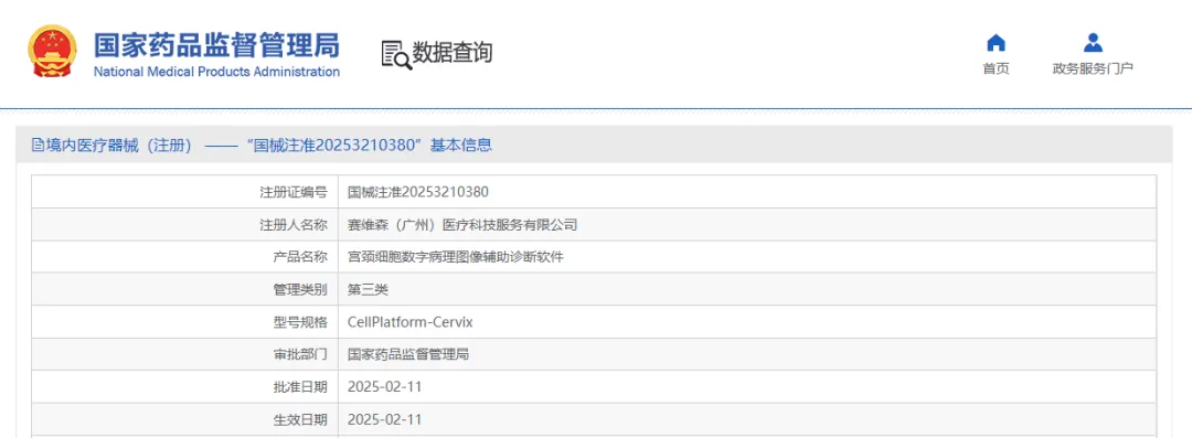 賽維森科技自主研發(fā)的“宮頸細胞數(shù)字病理圖像輔助診斷軟件”,正式獲得國家藥監(jiān)局(NMPA)頒發(fā)的第三類醫(yī)療器械注冊證,是宮頸細胞學領(lǐng)域首張“輔助診斷”三類證。人工智能正式升級為醫(yī)生的“超級助手”?。ㄗ宰C編號:國械注準20253210380)