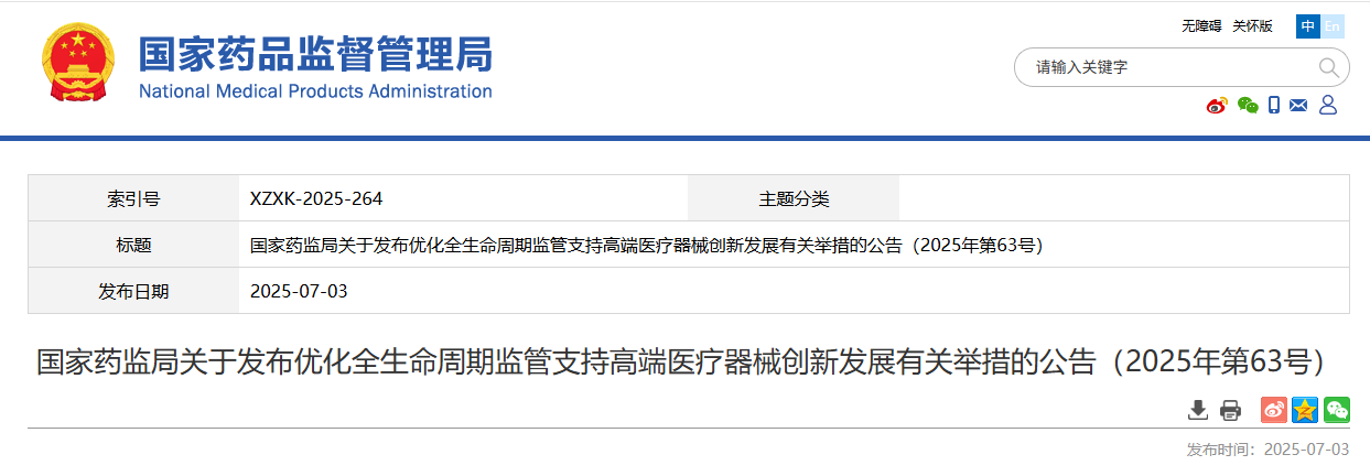 國(guó)家藥監(jiān)局關(guān)于發(fā)布優(yōu)化全生命周期監(jiān)管支持「高端醫(yī)療器械」創(chuàng)新發(fā)展有關(guān)舉措的公告(2025年第63號(hào))